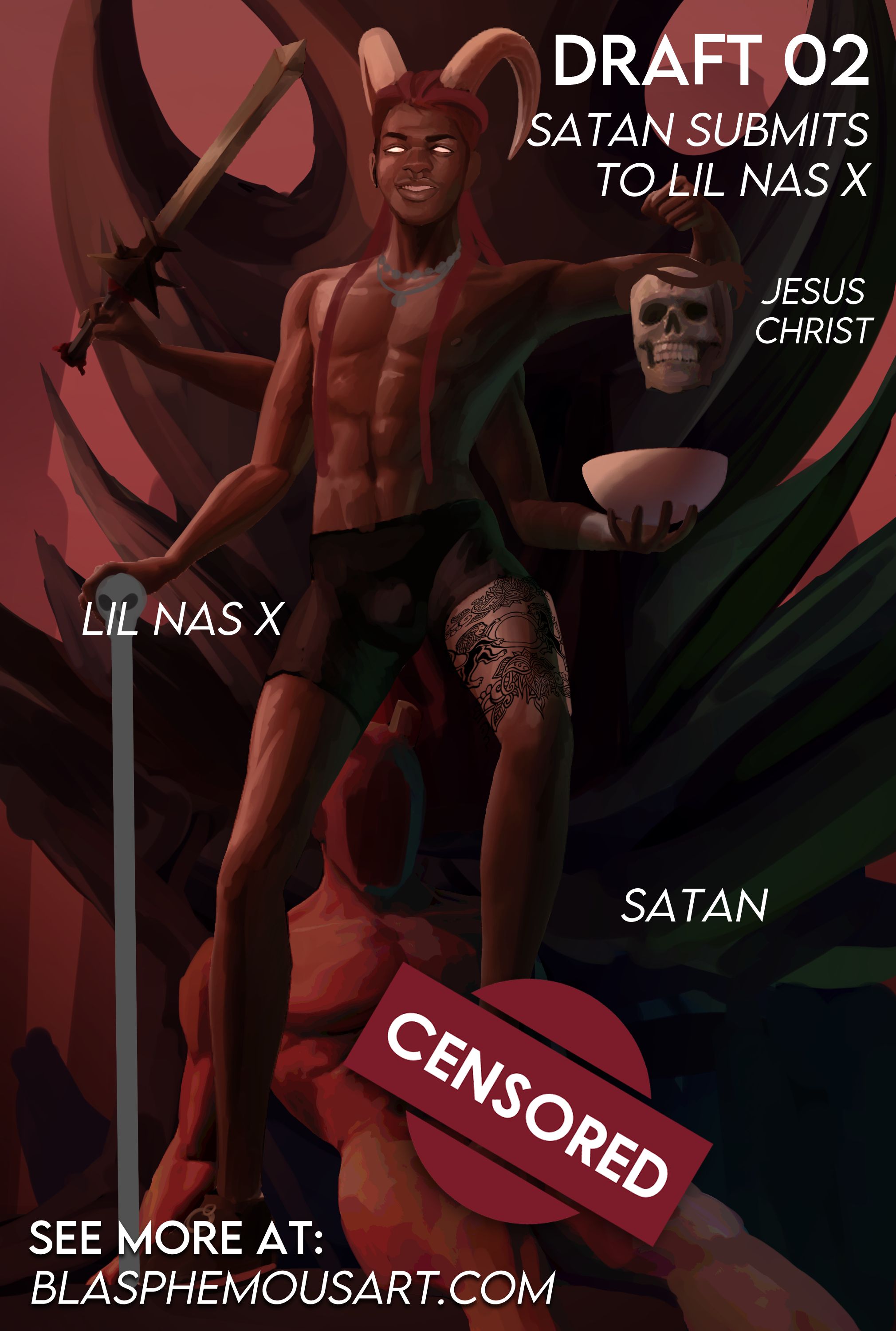 This art is inspired by rapper Lil Nas X’s extremely blasphemous music video for his new song “(Montero) Call Me By Your Name.” For the release of this song, he also released 666 pairs of custom shoes that contain human blood in the soles. This depicts him defeating and conquering the demons and religious dogma that made him hate himself for being gay.